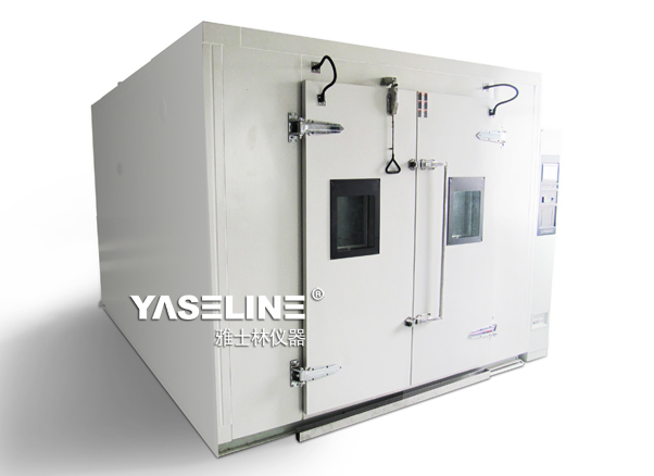 室體(試驗室主體(殼體))分為六個室體面及一扇雙開式室體大門,尺寸為1800×2000 mm,室體材料為內膽優質不銹鋼板(防止長時間在濕度運行狀態下內壁生銹),外膽為優質彩鋼板(國內名牌),保溫介質為聚氨脂硬質發泡隔熱,質輕耐抗擊,隔熱性能佳,大門材料同樣為彩鋼板制成,大門拉手為內外開啟式,以便于試驗人員從封閉的室內自由開啟大門。