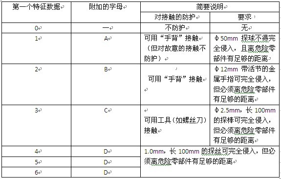 備注:接觸防護的級別比通過第1個特征數(shù)據(jù)所標(biāo)注的要高,或者只應(yīng)該標(biāo)注接觸防護的級別(第一個特征數(shù)據(jù)通過X來代替)。通過對接觸防護,只標(biāo)注一個防護級別,可以將有關(guān)的更低的防護級別包括進去。